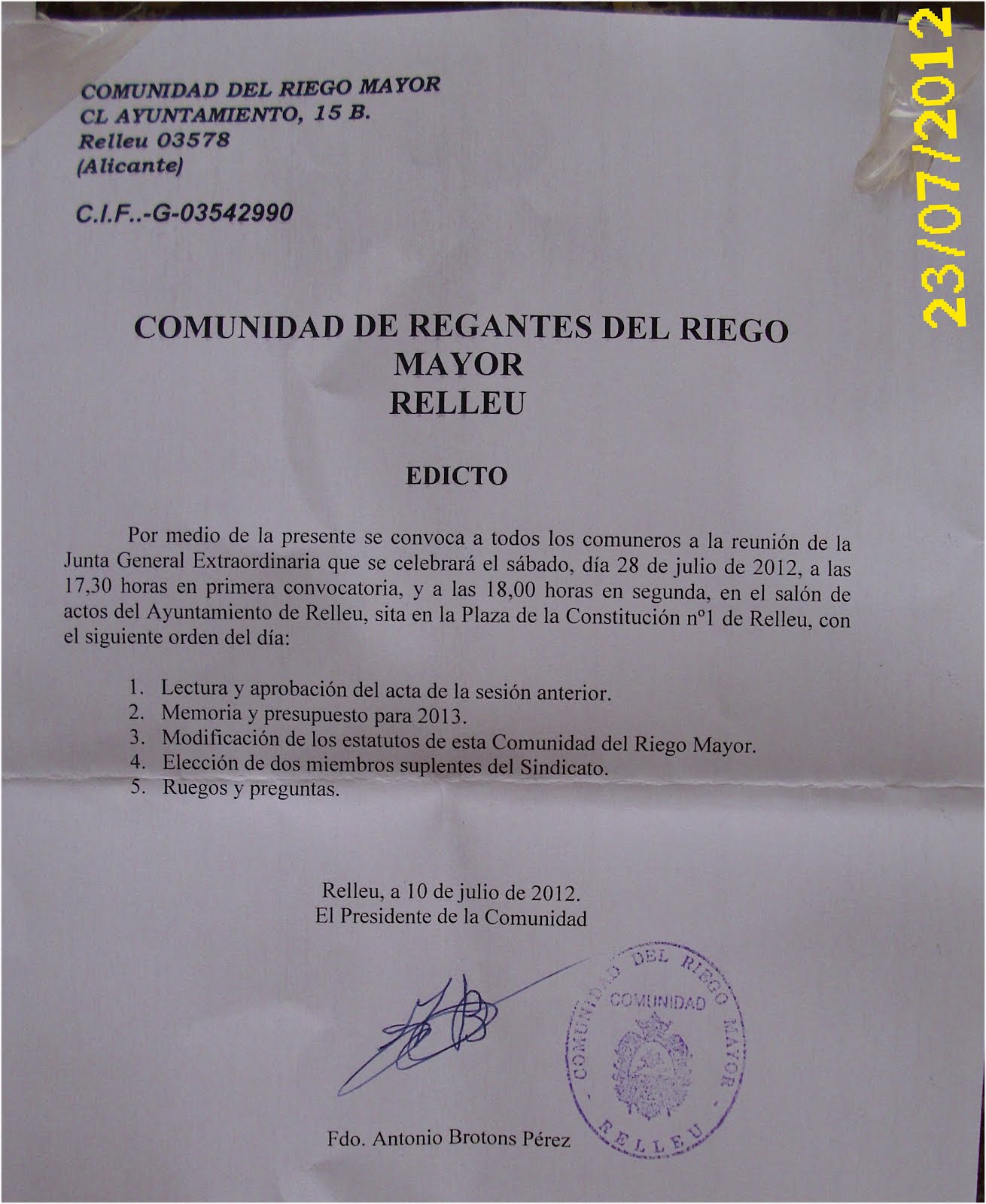Por medio de la presente se convoca a todos los comuneros a la reunión de la Junta General Extraordinaria que se celebrará el sábado. Día 28 de Julio de 2012, a las 17.30 horas en primera convocatoria, y a las 18:00 horas en segunda , en el salón de actos del Ayuntamiento de Relleu, sita en la plaza de la constitución nº 1 de Relleu, con el siguiente orden del día: